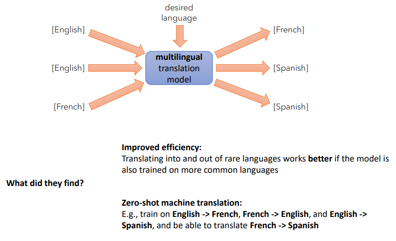English:French, French : English 그리고 English:Spanish 를 충분히 학습한 모델이라면 학습시키지 않은 French: Spanish 의 번역이 가능했다는 점과 함께, 데이터가 부족한 '소수 언어'를 어느정도 이해할 수 있다는 점이다.