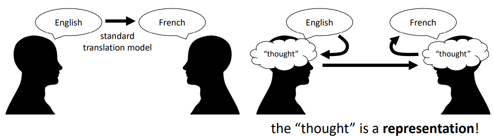 하지만 딥러닝에서는 '생각'이라는 단어의 의미 자체를 전달하는 것을 통해 다른 언어로 번역이 가능하다고 말한다.
